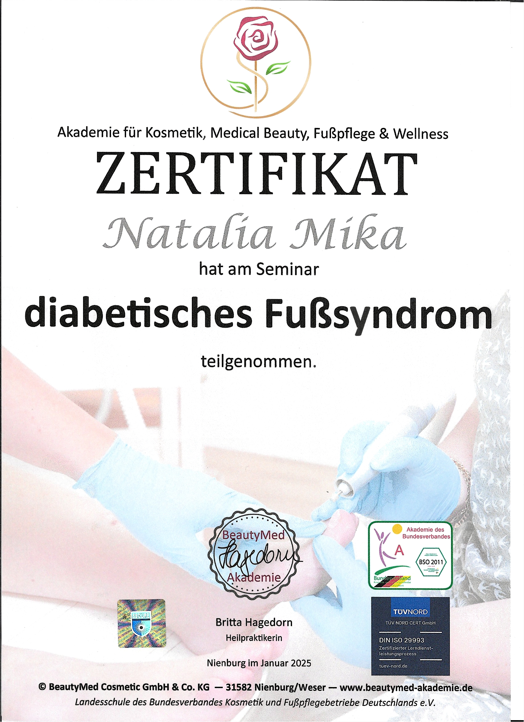 Ich bin gelernte Altenpflegerin. Mit meinen 39 Jahren bin ich 3-fache Mama und glücklich verheiratet. Parallel baue ich meine Selbstständigkeit zur Fachfußpflegerin in kosmetischer-medizinischer Fußpflege / Prävention auf.